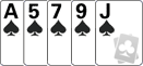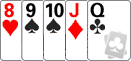 Any five card sequence in the same suit. (eg. 8,9,10,J,Q and A, 2,3,4,5 of same suit). All the cards are of the same suit, and all are consecutive. Ranking between straights is determined by the value of the high end of the straight.